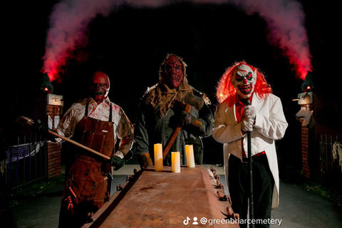 Greenbriar Cemetery is a home haunt with scares around every corner. A home haunt with animatronics, graveyard, pirate ship, coffin race car, many special effects, lights, Fog, Projections, fire, and sounds! we operate all October long and live actors on select weekends! Free attraction open to all, Donations accepted